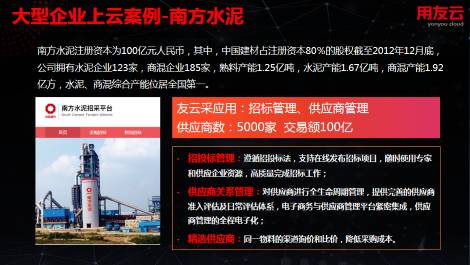 与互联网融合提升 建材行业智能制造水平 专家提到,如何才能深化制造业与互联网融合,就要将两化融合具体到各个行业里。建筑行业作为国民经济的一大支柱,通过工业互联网重构企业的生产方式,可以增加收入、降低成本、提高效率、控制风险。“十二五”期间,信息技术对建材企业设计、研发、生产、经营、管理等环节的渗透日益加深,能源监测系统、余热回收利用系统、计算机集散控制系统等适用技术在骨干企业逐步推广应用,行业信息化水平取得了明显进步。水泥电商比例大幅提高,玻璃产品现货和期货两大电子商务平台建成并平稳运营。建材商城线上线下互动日益广泛,推动建材模式和业态不断创新。建材行业数字化研发设计工具普及率超过47.4%,关键工序数控化率超过50.5%。 用友精智赋能 建材行业走向平台 用友网络智能制造高级专家耿兆强博士认为,在用友精智工业互联网平台的整体架构中,用友工业物联网云平台可以实现物联的即插即用,快速连接信息系统和硬件设备。同时,用友精智有三大内核,即个性化定制、网络化协同和设计制造一体化。在精智平台的应用中,具有工业特性的有三大云应用,即设计云、制造云和服务云。用友拥有服务制造企业近30年的经验和行业积淀,基于精智工业互联网平台,打造了软硬一体化智能制造解决方案,可以高效的推进建材行业互联网+智能制造。 基于精智平台的用友智能制造整体解决方案 用友网络智能制造高级专家耿兆强博士 在实践层面,天瑞水泥作为工信部 “智能制造试点示范企业” 实现了从数字工厂到智能工厂的转变。一方面借助移动互联网、物联网等技术,实现了材料、能源、工艺、设备运行、投入产出等数据的实时自动采集、生产运行智能监控与智能分析、生产资源集中调度管理,逐步建成了智能工厂,取得了显著的节能减排效果:能源消耗减少3-5%,减排CO2约16.1万吨、SO2约1060吨、粉尘1.61万吨。另一方面借助用友智能物流一卡通系统,实现计量车辆智能化管理,包括:车号识别、车位控制、重要数据以及音频、视频的智能采集与控制。司磅人员由30人减少为5人,年节约人员成本100万元,作弊行为减少3%,年减少销售损失197.1万元。在智能制造转型升级的道路上,也将走得更远。 用友云助力 建材企业应用上云 据耿兆强介绍,用友采购云,致力于为企业提供专业的第三方采购平台,以水泥备件、设备资材、MRO的电子商务为手段,为企业之间工业品交易提供商务、金融、物流、售后全生命周期的采购信息化与云服务。其中南方水泥公司水泥、商品混凝土综合产能位居全国第一。南方水泥通过友云采,实现三大价值,一是在线发布招标项目:随时使用专家和供应企业资源,高质量完成招标工作;二是对供应商进行全生命周期管理:提供完善的供应商准入评估及日常评估体系,电子商务与供应商管理平台紧密集成,供应商管理的全程电子化;三是精选供应商:同一物料的渠道询价和比价,降低采购成本。最终,实现了降本、增效、阳光、转型的核心价值。 南方水泥友云采应用 走向智能制造 用友与您同行 用友公司成立近30周年,从解决部门级应用的财务软件1.0时代,到解决企业级应用的ERP管理软件2.0时代,到现在进入服务社会级应用的用友云3.0时代,致力于为企业客户提供一站式的社会化服务。在智能制造领域,用友将基于精智工业互联网平台,通过“全局化”“一体化”“ 行业化“云化”赋能中国制造企业,助力中国企业迈向《中国制造2025》。
