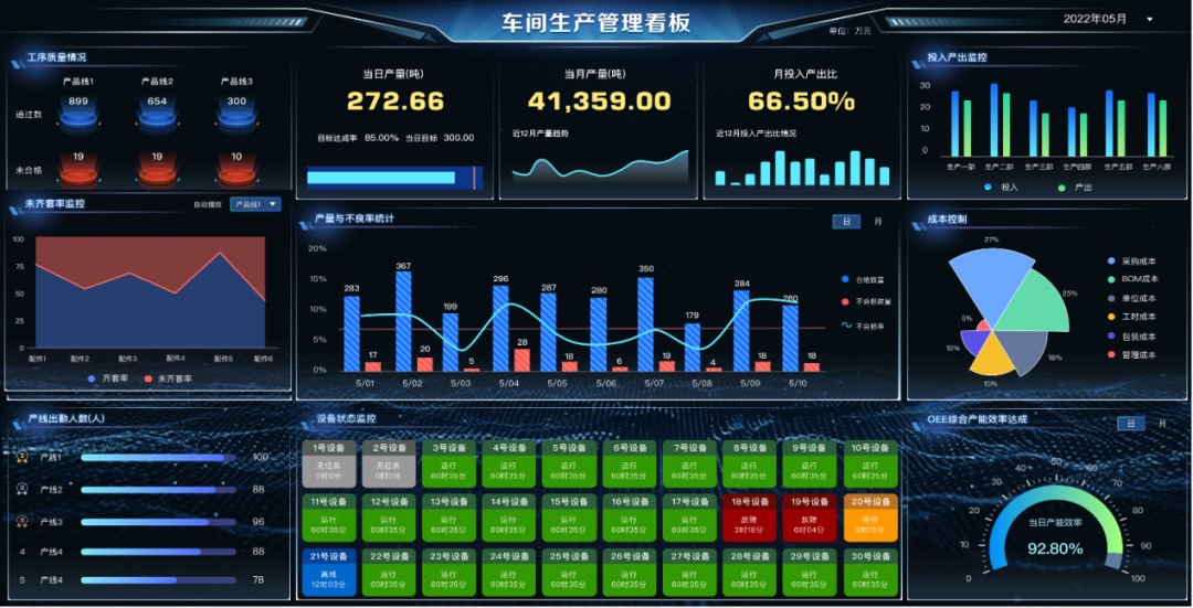 4 数据驱动与智能运营是新手段 随着制造企业与新一代信息技术的深度融合,企业日常经营必然会产生越来越多的数据,数据将成为企业的一项重要资产。通过数据采集、分析和呈现,制造企业可以更好地理解市场需求、优化产品设计、提高生产效率和质量,数据已在生产、运营、销售等各个环节发挥重要作用。另外,数据对于企业的整体决策和发展方向也有着决定性的影响。数据驱动的智能运营模式是数智企业的典型特征,能够为制造企业提供更高的生产效率、更优化的资源利用和更好的产品质量,从而让企业有可能在激烈的市场竞争中脱颖而出。 还是以金冠电气为例,以U9 cloud结合用友数据服务作为支撑,构建自己的智能化业务运营指标体系,实现数字化还原业务全貌,数据驱动业务运营绩效持续改善。 通过数据驱动,使库存资金下降的同时零部件齐套率在提升,同时车间标准件盘点的差异率也在下降;各车间入库完成率持续提升,这都是通过数据驱动为企业带来的经营效率的提升。