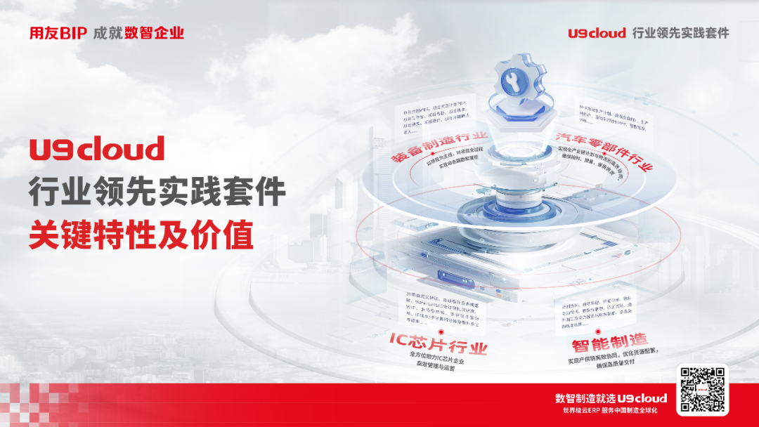 创建于2008,云化于2021,蜕变于2024,任凭企业服务产业风云变幻,用友U9 cloud始终持守服务中型及中大型制造业数智化的定位,不走偏,不浮夸,只专注陪伴制造企业一路进深。 从软件时代的U9到云时代的U9 cloud,用友在每一个特定的需求场景下,都全力以赴,助力广大中国制造企业降本增效,实现业务升级和管理升级,用实打实的利润成效回报客户,与客户一路共成长。 时代飞速变化,专注成为了一种定力。16年来,用友U9 cloud见证了中国制造走向中国创造,“极其成熟与专业”是客户对它的评价。可以说,半部中国制造业的数智化发展史,都写在用友U9 cloud里。 这些深藏在专家智慧之中,也沉淀在企业实践里的宝贵行业经验,如果可以显现出来,复制到更多制造企业,毫无疑问可以更大规模地响应客户需求,加速推动整个行业的数智化转型进程。 责无旁贷地,身为制造业数智化的时代担当,用友U9 cloud把多年来积累的行业化知识进行有效的封装和沉淀,推出“行业领先实践套件”,使更多企业能够受益于行业领先的业务模式和实践经验,有效的帮助企业降低转型成本、加速转型进程及提升业务价值。 站在制造业新质生产力革命的大视野下,用友U9 cloud以敏锐的行业洞察与丰厚的领先实践,加速赋能细分行业制造企业,助力中国制造企业拓展海外市场、提升国际竞争力。