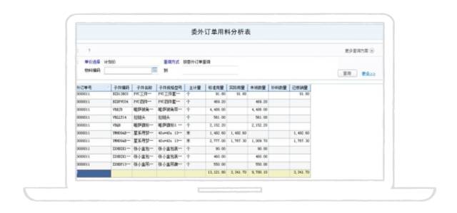 仓库按委外订单用料要求向委外商发送生产辅料,采购部门按入库单对已发材料在系统中核销处理,监控并追回剩余生产辅料,有效控制成本。