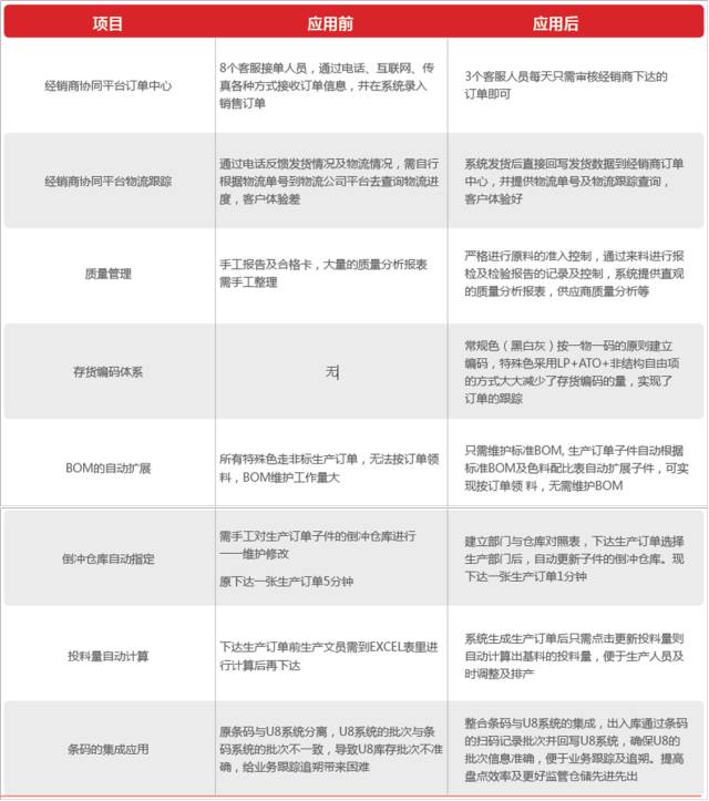 原条码与U8系统分离,U8系统的批次与条码系统的批次不一致,导致U8系统库存批次不准确,给业务跟踪追朔带来困难。现在将条码与U8系统进行了整合,出入库通过条码扫码记录批次,并回写U8系统,确保U8系统的批次信息准确,便于业务跟踪及追朔,仓库的收发货准确率达到100%,提高盘点效率且更好地监管仓储先进先出。根据条码中的批次信息,让市场上的假货立刻原形毕露。