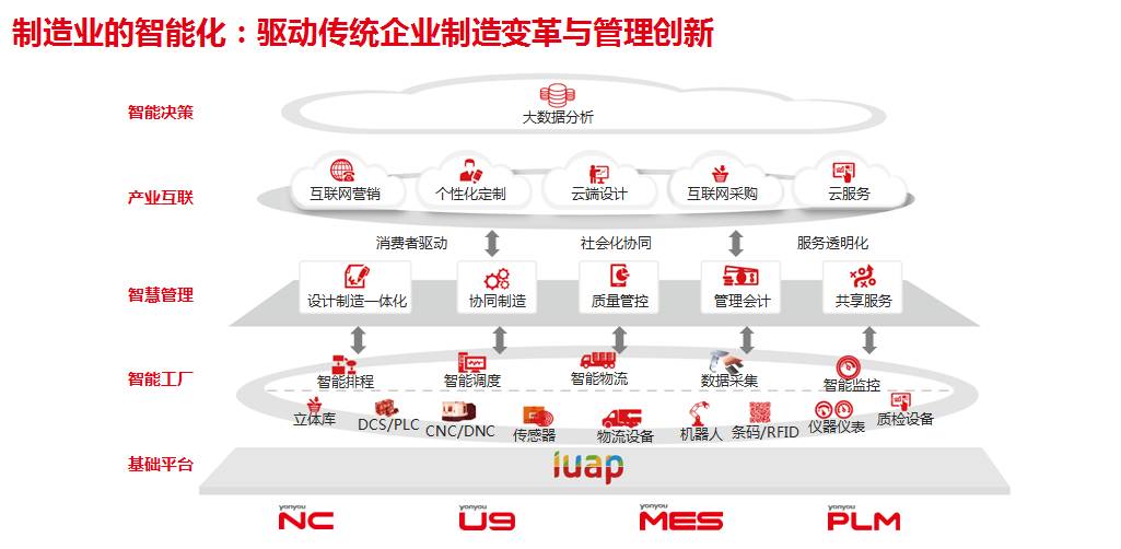 “关于软件定义智能需要回答三大问题,即软件到底定义了什么、软件是如何定义智能制造的?软件将如何更好地定义智能制造?”工业和信息化部信息化和软件服务司副司长安筱鹏在致辞中指出,要从三点理解软件如何定义智能制造:第一、最终的资源优化配置是目标;第二、信息技术通过推动数据的自动流动以提高资源的配置效率;第三、软件就构建了数据自动流的体系和准则。 因此,软件无处不在,软件定义着制造业的未来、定义智能制造。用友网络科技股份有限公司高级副总裁王健也在其中指出:“软件最核心的是挖掘了数据的价值,让数据活起来。”制造企业走向智能化也需要一个整体的解决方案。 用友网络科技股份有限公司高级副总裁 王健 制造业走向智能化 制造业走向智能化也成为当下的共识,用友公司也致力于驱动传统企业制造变革与管理创新。基础平台+智能工厂+智能管理+产业互联+智能决策是用友公司给出的制造业走向智能化的全貌。制造业走向智能化是基于基础平台打造智能工厂、实现智能管理和产业互联,最终走向智能决策。 其中,基础平台指的是制造业智能化的支撑平台。“用友公司基于面向智能制造的工业PaaS云平台,主要是帮助制造企业实现基于物联网、大数据的实时处理与分析、实时监控与分析预警、智能决策执行、企业内外部系统互联互通、第三方互联网服务接入等。”王健指出。与此同时,智能工厂也包含了四层架构,即智能硬件终端平台、智能数据采集平台、智能运营管理平台和可视化监控平台。 “用友公司从财务共享、人力共享等层面帮助企业实现智能管理。”王健指出,其中财务共享可以引领企业迈向财务2.0时代,帮助企业实现全业务共享应用、多共享中心营建。而人力共享则强化集团化企业人力资源管控的传统优势、推动集团化企业人力资源共享服务转型,并构建企业人力资源互联网化新平台与生态圈。 有很多大型企业已经借助共享服务实现智能管理进入新的阶段。比如碧桂园财务共享服务中心已服务100个项目公司、实现9大类财务业务共享,将 服务1000家项目公司、70000多名员工。 产业互联其中一点是指帮助企业通过数字营销实现全通路共赢营销。“用友的数字营销核心就是帮助企业找客户、做转化、管生意和出价值。”王健现场指出,用友公司通过实践提炼出基于五种核心价值的五种客户经营模式,即线上线下融合模式、会员制营销模式、渠道深耕模式、直控终端模式和行业平台模式。 比如古井贡酒就通过数字营销平台构建以消费者为中心、线上线下融合的古井全产业圈,最终实现产品渠道双轮驱动的数字化营销转型。 与此同时,“互联网采购也让企业走向产业互联。用友公司也推出适合大中型企业互联网采购服务平台,同时提供采购云服务。”王健指出,最终都是希望大中型企业在互联网时代的采购可以更加简单。 “智能决策也是企业走向智能化非常关键的要素。用友企业大数据就是实现从流程驱动到数据驱动,发掘数据价值。”用友王健指出。 用友智能制造赋能中国企业落地《中国制造2025》 在演讲中,王健讲解了制造企业走向智能化所需要完成的四大要素,最后其也通过众多案例讲解了用友智能制造是如何赋能中国企业落地《中国制造2025》的。 航天八院, 基于国家《中国制造2025》的背景,航天八院已经着手建设2025智慧八院,希望在2025年实现国际一流宇航企业,以提高科研生产效率为出发点,以“集成”“互联”“协同”和“智能”为手段,帮助航天八院实现从传统军工制造向数字军工、智能军工制造的跨越。主要是分三步走,即:第一步实现全院设计到制造的全面数字化;第二步实现流程自控;第三步实现企业自成长,满足八院决策、运营、市场营销等需求。 目前通过与用友的合作已经完成了第一步,正走在第二步。航天八院借助物联网、大数据、数字仿真、生产仿真等技术,实现了科研生产的精细化、可视化、数字化、智能化,极大提升了八院科研生产管理水平,并取得了良好的经济效益。以下属总装厂为例:产能提升15%、库存下降12%、制造成本降低10%、计划按期完成率提高25%。 另外还有天瑞水泥,主要实现了从数字工厂到智能工厂,还有宝舜化工等。王健总结到用友智能制造希望帮助中国制造业迈向“新五化”,即数字化、集成化、移动化、可视化和智能化。其中数字化指业务管理数字化、过程监控数字化、质量管理数字化;集成化指设计制造一体化、计划执行一体化和多系统集成互联。 在这届的软博会上,我们看到业界众多关于软件如何定义未来的观点。对于中国企业而言,企业信息化迎来了3.0时代,用友也希望与中国制造共成长,最终迈向《中国制造2025》。