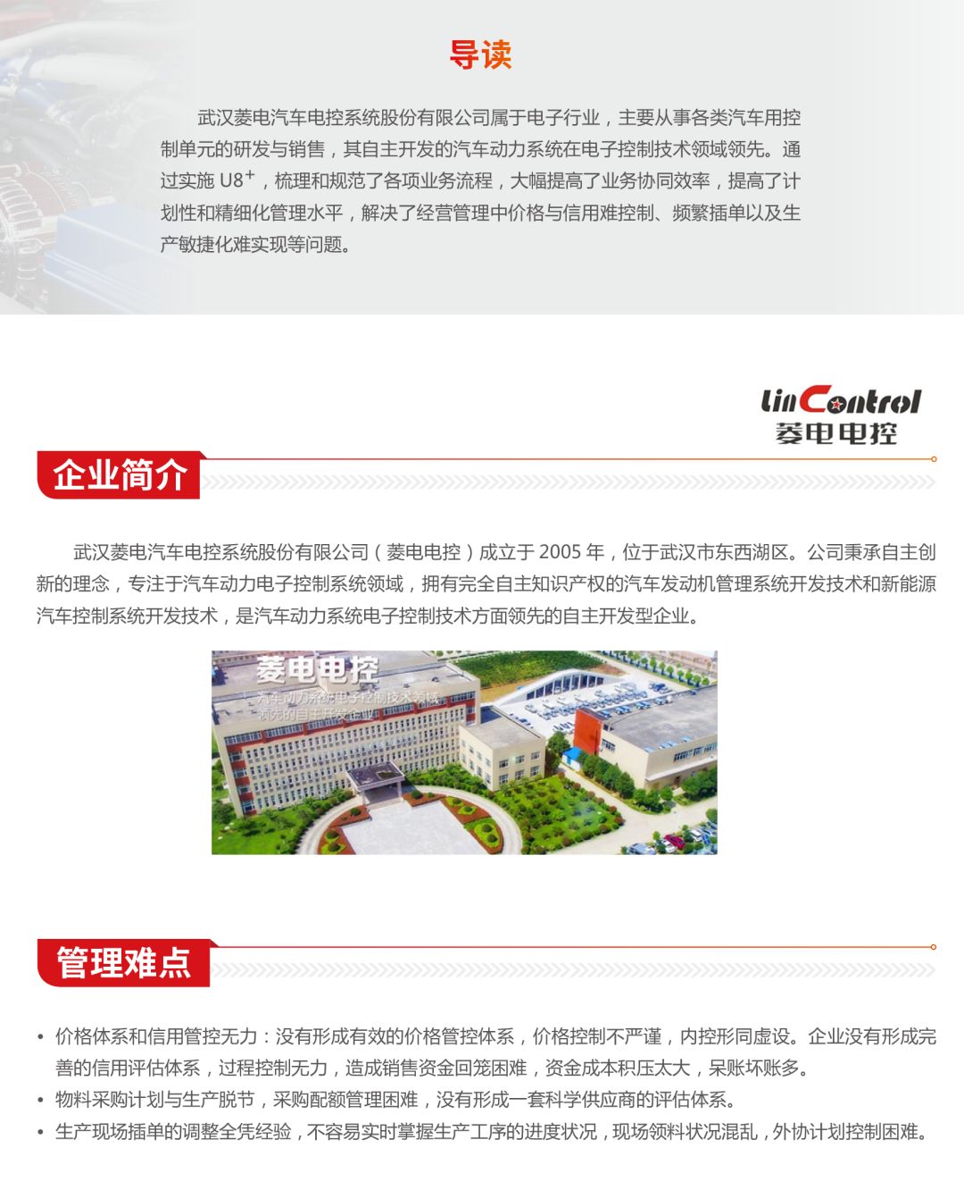 武汉菱电汽车电控系统有限公司属于电子行业,主要从事与各类汽车控制单元的研发与销售,其自主开发的汽车动力系统在电子控制技术领域领先。通过实施u8+,梳理和规范了各项业务流程,