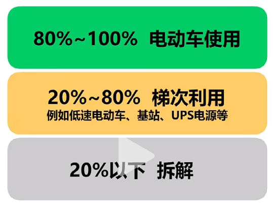一般来说,新能源车对动力电池报废的标准是电池容量低于80%。退役电池首先会进行电量的检测和测试,然后通过修复和重组,将其变成梯次产品,可以用于其他的领域,比如低速电动车、通信基站、储能电池、智能路灯等等,充分发挥其剩余价值。对于电量低于20%或者完全报废的动力电池,则需要进行拆解回收与再生利用。