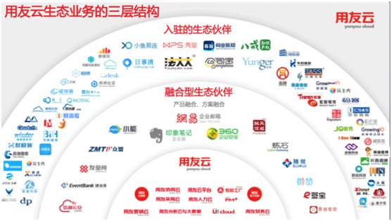 目前,用友云生态中包含一般入驻伙伴和融合型伙伴。用友选择各领域最优秀的生态伙伴产品与用友云进行深度融合,形成一体化整合应用方案。