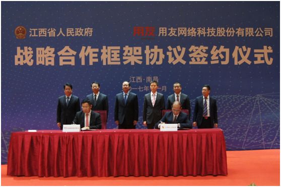 江西省人民政府副省长吴晓军(前排右一)和用友网络董事长兼CEO王文京(前排左一)代表双方签订协议。