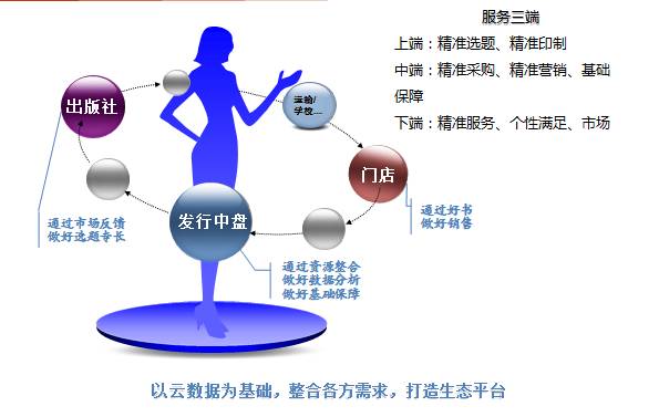 浙江省新华书店集团以云数据为基础,整合各方需求,打造生态平台。出版社、发行中盘、门店等各方都有不同需求,因此要做到服务三端:上端,要满足精准选题、精准印刷;中端要精准采购、精准营销和基础保障;下端要实现精准服务、满足个性化需求等。