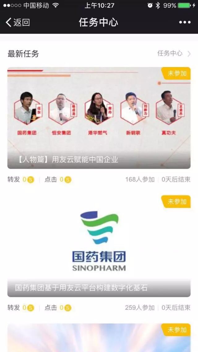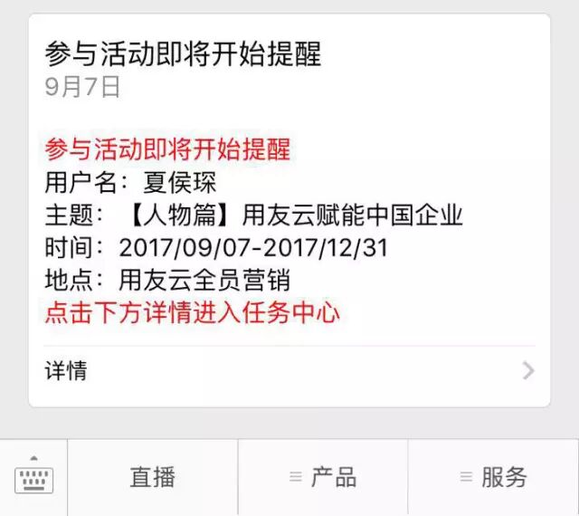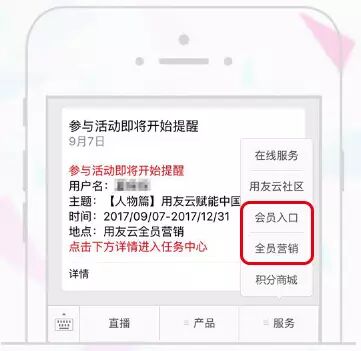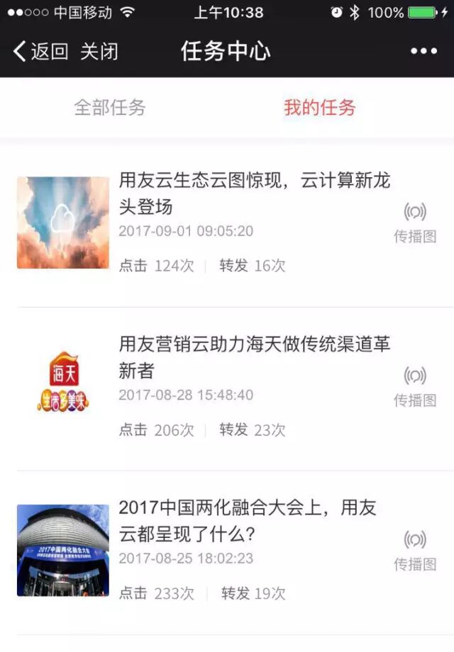 什么是用友云全员营销平台 用友云全员营销模式 =社交网络推广+社交网络运营,通过社交人脉关系投放,通过积分商城任务参与运营,推动全员营销,快速推出去,引爆,快速覆盖,获得精准传播链数据,大幅降低企业广告成本。 如何加入用友云全员营销 加入用友云全员营销平台,成为企业品牌传播的一员。体现你朋友圈的影响力,让你的星空连成线! 1、扫码关注用友云,加入用友云全员营销平台 2、如果是员工请点击全员营销,如果是普通用户请点击会员入口 3、注册员工或者会员(员工需要获得部门编码,请联系全员营销运营人员。会员直接注册体验即可) 注册成功~ 就能开始获取积分之旅了~ 如何转发获取积分 全员营销最牛的地方就是放置play~,只要简单的转发朋友圈和微信群,积分就能滚滚而来,不需要一点操心,只需要最后看着你蹭蹭涨的积分与传播效果的星空图就行了,就是这么简单。 1、收到任务提醒,点击就能打开任务列表 2、选择任务转发 3、了解可以获取的积分(分享获得一次积分,你的好友转发你的内容你将再获得一次分享积分;点击你转发的任务获得一次积分,你好友转发你的内容被点击,你将再获得点击积分。) 4、转发到朋友圈或者微信群,坐等积分滚滚而来 如何了解积分效果 每个任务我们都可以统计自己的传播效果,通过星空图,你将会知道谁转发了你的内容,谁了解了你的内容,便于再次跟进。 1、点击任务,了解传播图 2、查看自己的星空图,有名字的是注册全员营销的员工或会员,有微信昵称的是关注用友云应用微信号你的好友,游客是你不认识的人。邀请更多用户关注用友云应用,把你的星空图变成你的利器! 兑换积分商品 用友云全员营销平台提供了大量企业福利等待你的兑换,一种不一样的企业福利模式。你不来看看么!我们也欢迎伙伴厂商入驻哦! 1、选择自己心仪的礼品兑换 2、通过积分换取礼品 3、等待发货,我们会尽快为您配送礼品,请不要着急哦~ 访问用友云移动官网 m.yonyoucloud.com 咨询电话:4006-815-456 点击阅读原文在线咨询