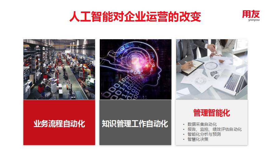 基于人工智能的三股力量:数据、计算力和算法,王文京认为技术能力与业务交叉的组合使得人工智能今天在商业得到越来越深刻的应用。人工智能对于企业运营的改变包括使业务流程自动化,知识管理工作自动化,以及管理本身的智能化,包括数据采集到反馈、监控、评估,智能化的分析预测以及决策的智能化。