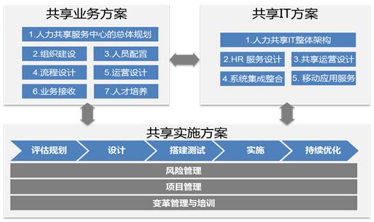 人力资源共享服务转型涉及组织、流程、人员的变革重组,IT系统的建设实施以及配套的项目管理、变革管理活动,相比单纯的管理咨询项目或IT项目,人力共享项目的具备一定的复杂性与难度,需要在科学严谨的方法论指导下展开实施推进。